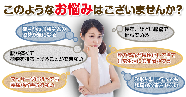 腰痛はよくある症状だからといって放置する人が多いのが現状です。しかし、腰痛を放置してしまうと慢性化してしまい治りにくくなったり、重症化し日常生活にも影響がでる恐れもございますので根本的に腰の痛みを改善する必要があります。